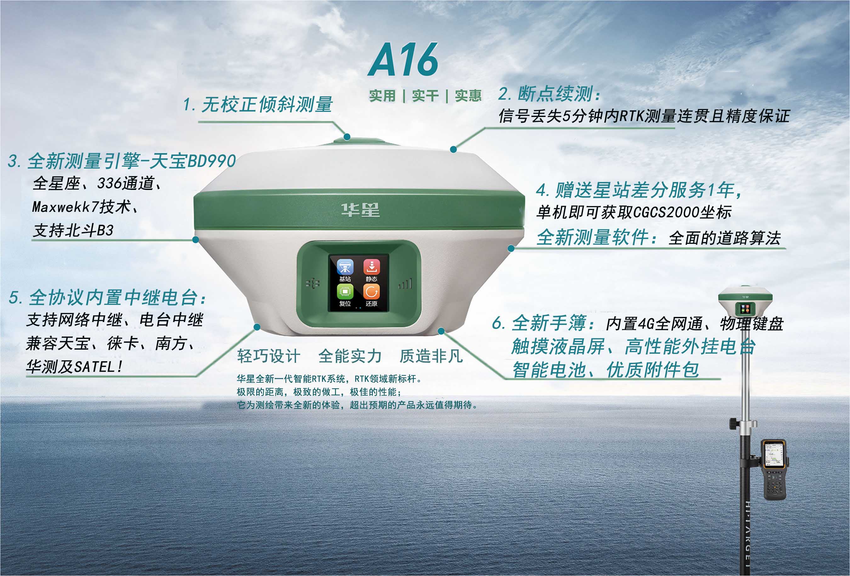 A16是華星品牌新一款高端GNSS接收機,新一代測量引擎,支持星站差分,內置4G全網通通訊和多協(xié)議電臺,采用全新外觀設計,鎂合金結構,Linux3.2.0操作系統(tǒng),內置高清OLED顯示和電容式觸摸屏,是一款極致、智能、輕巧的測量型GNSS接收機。